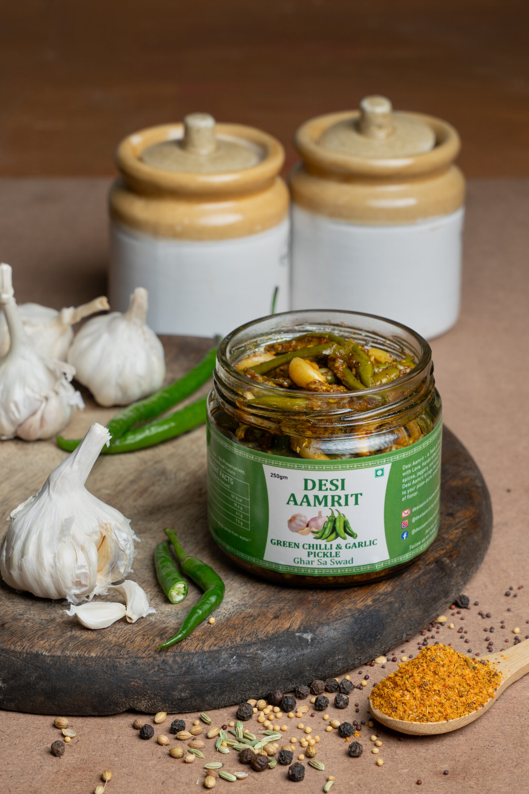 Chili Garlic Fusion is a bold, flavour-packed creation inspired by maa ke haath ka teekha-lasooni achar. Fresh green chillies and aromatic garlic are blended with hand-ground desi spices and slow-matured in mustard oil. Made in small batches, this pickle captures the perfect balance of heat, aroma, and nostalgia—the kind that instantly elevates a simple meal.